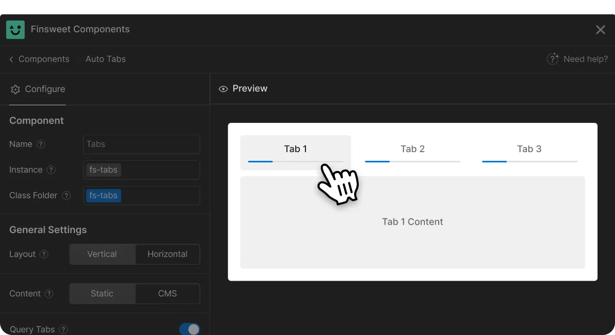 Create highly customizable CMS tabs in Webflow with a visual interface.